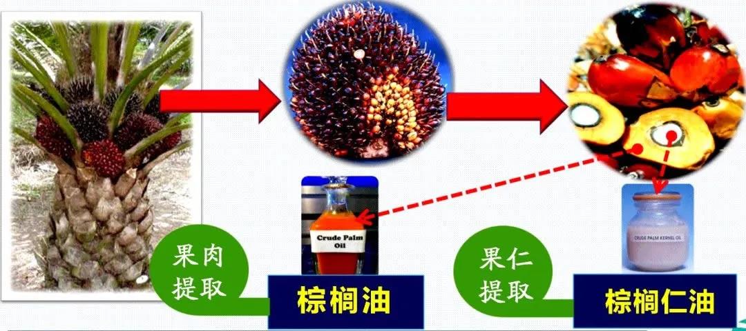 油棕果由外果皮、中果皮(成熟的中果皮又稱果肉)、內(nèi)果皮和果核仁組成,棕櫚油是從油棕果果肉中榨取的油脂,又稱棕油、棕皮油;而由果仁壓榨出的油稱為棕櫚仁(核)油。